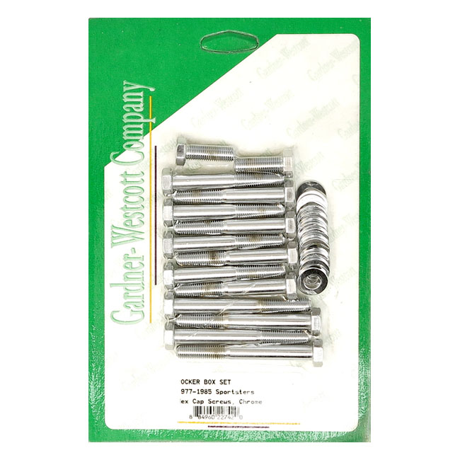 GW, Sportster rocker box bolt kit. Hex, chromeOEM style replacement with hex head bolts. Complete rocker box mounting kit with all required bolt and washers.
