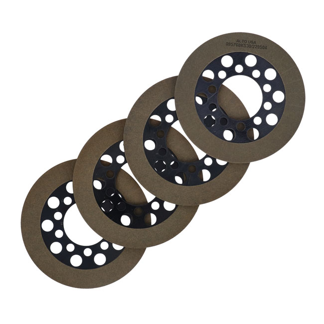 Includes 4 friction discs. Sold as set. Aramid material is a step up from Alto's 'Red Eagle' friction material and is also bonded to a lightweight backing plate. The Aramid series are 'High Performance' friction plates for motorcycles which are equipped with high-output engines that are ridden hard. They offer excellent heat resistance and endurance. Just ask anyone who has worked with or has ridden a bike in which a set of these Alto clutch plates were installed. OEM replacement reference 37930-41 (2481-41)