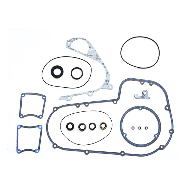 With silicone beaded paper primary cover; derby cover and both types inspection cover gaskets. Inner primary gasket; o-rings; seals and hardware.OEM replacement reference amongst others 34901-85; 25416-84; 34906-79A; 34906-85A; 25416-70; 6099; 34902-79A; 8975;