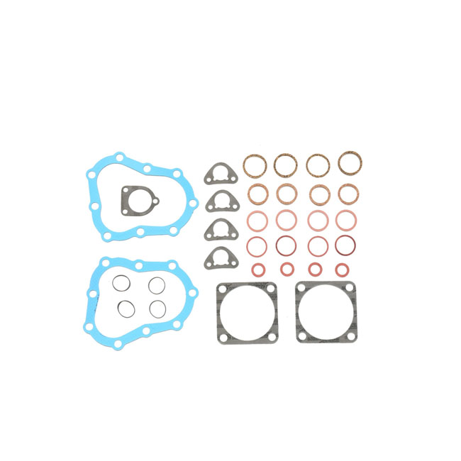 3-7/16" / 3-27/64" bore. With 1mm (.040") Blue PTFE coated paper cylinder head gaskets and 0.75mm (.030") reinforced fiber cylinder base gaskets. Includes all gaskets and seals to rebuild the top end. OEM replacement reference 17033-36 (55-36B)