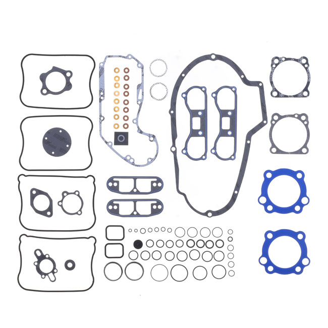 No oil seals included. 3.350" bore. With 1.2mm (.045") Blue PTFE coated paper cylinder head gaskets and 0.5mm (.020") fiber reinforced paper base gaskets. Includes primary gasket 0.75mm (.030") thick fiber reinforced paper. Otherwise complete with all gaskets; O-rings and primary gaskets required for a complete engine overhaul.Complete as shown. OEM replacement reference 17026-86A (but with 16665-86 head gaskets for XL1100 only).