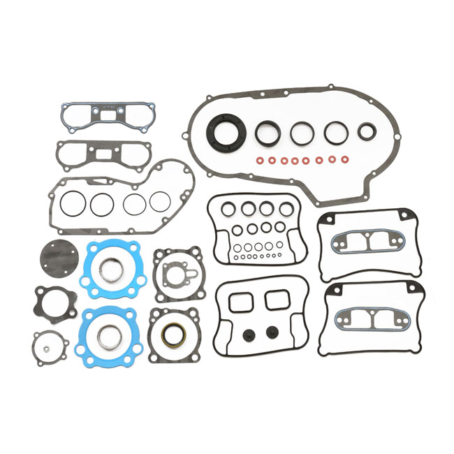 3.5" bore. With 1.5mm (.060") Blue PTFE coated paper cylinder head gaskets and 0.5mm (.020") reinforced fiber cylinder base gaskets. Complete with primary cover gasket 1.5mm (.060") thick AFM (Aluminum Foamet Material). Complete with all gaskets; O-rings; seals and primary gaskets required for a complete engine overhaul. OEM replacement reference 17026-91A.