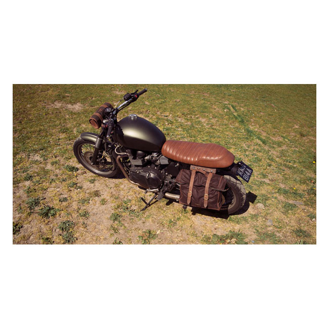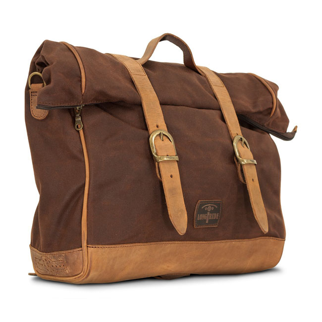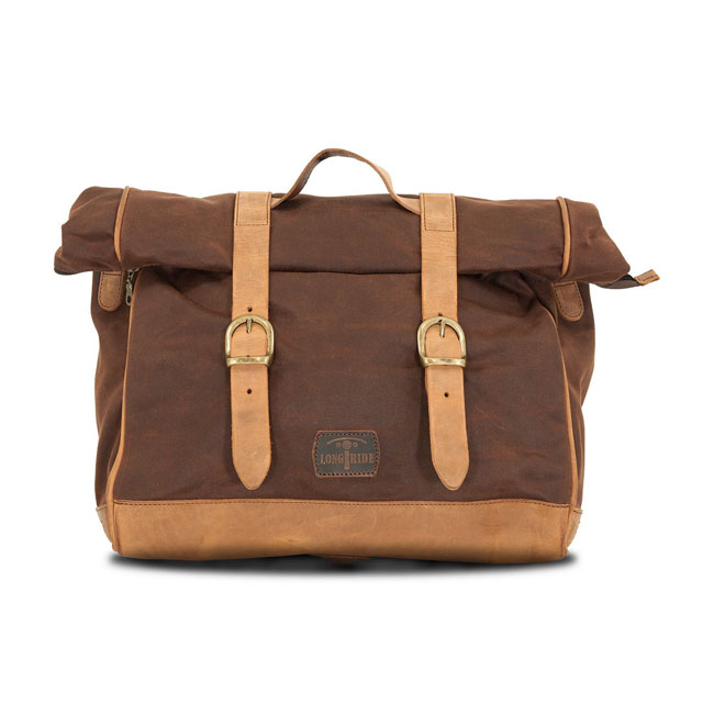 Longride, 'Old Chopper' waxed cotton saddlebag. Marron BrownLarge. Made from waxed cotton and ranger leather. Approx. dimensions: 42cm x 30 cm x 15cm.