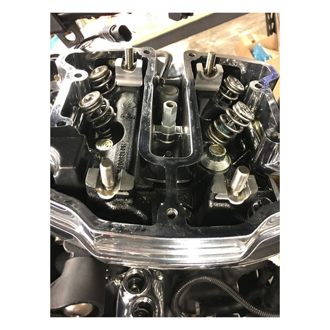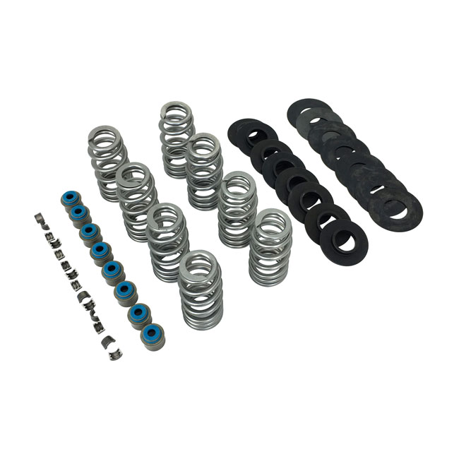 Must reuse OEM steel upper spring collars. Installed pressure 134lbs@1.375" (0.405 lift); 103 lbs@1.520" (0.550 lift); coil bind@.920". Direct replacement; installs without machining or rocker box clearancing. High tensile chrome silicone wire with a shot-peened heat treatment and a super NexTex® finish. Kits include springs; lower collars; no upper collars; shims; keys and Viton® seals.
