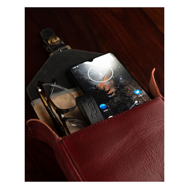 Perfect for the small essentials as keys; gloves; wallet; tobacco; bandana; and such. 6 super strong magnets are individually sewn into the backside of the bag; for a secure magnetic clamp. Off the bike; just hook it on your belt. Handmade from the finest leather that looks better as it ages; with excellent build quality of yesteryear.Dimensions: 18cm high x 14cm wide x 5cm deep.