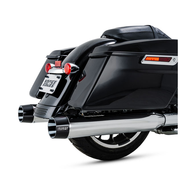 Witness the intersection of engineering precision and unparalleled style. The Blackbird 450 Slip-Ons will elevate your Milwaukee-Eight Bagger to new heights of style and performance. Inspired by the sleek sophistication of jet engine exhausts; the Blackbird 450s feature 4.5" tapering billet end caps with internally machined channels and a CNC milled logos on the outboard sides. But it’s not just about looks; Vance & Hines took the all important roar to the next level. The Blackbird 450 Slip-ons features the most aggressive baffle core; specially designed for the M8 engines. Feel the authentic thunder and power as you open the throttle; making your iconic American V-Twin as exhilarating as riders experienced Harley-Davidson for over a century.- Massive 4.5-inch muffler bodies - Tapered machined billet end caps - Chrome plated muffler housing - Black contrast finish end caps