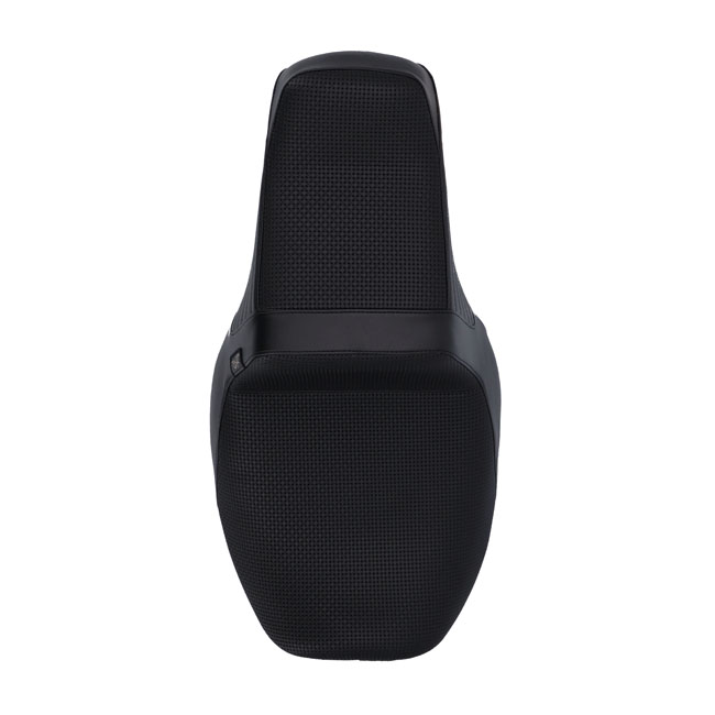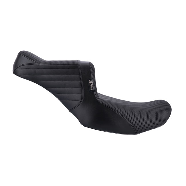 Rider seat area 12.25" wide; passenger seat area 7.75" wide. Basket Weave stitch upholstery. Built with LePera’s Marathon Foam on a steel base plate for maximum stability and comfort. The whipped tail improves passenger lower back support. That; combined with the unrivaled high arching back support for the rider makes this a serious in contender when it comes to a mix of style and comfort.
