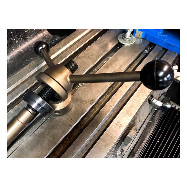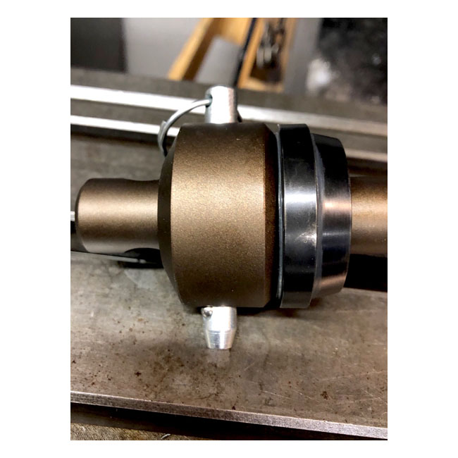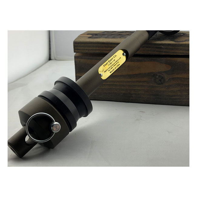 Used to press bearing neck cup into the frame neck and bearing races into the cups. Neck cups can be as much as a .004"-.006" interference fit. That's why it takes a big hammer when you install them that way. This tool gently presses them in like butter without damage or uncontrollable forces. - Makes easy work of installing neck cups & races into motorcycle frames - Incorporates unique thrust bearing system - Critical components made from steel alloy that has roughly double the tensile strength of mild carbon steel - Quick-adjustable length to work with a wide variety of H-D; aftermarket; and custom made frames - Comes with 2 anvils that work with all H-D neck cups that are the tapered roller bearing type - If you have an oddball motorcycle and the anvils don't fit your cups; the adjustable length allows you to make extra spacers that better fit your cups - Cerakote finish - USA made. Note: Fast Eddy advises you to only press cups in your frame that already have pre-installed races. Or press new races into the cups at the same time you're pressing the cups into the frame. Do not press cups into the frame without bearing races.