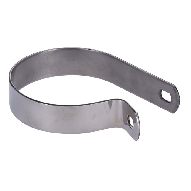 Paughco, Muffler P-clamp 1-7/8" chromeChrome plated steel. 1-7/8" (4.8 cm) inside diameter. Offset and with short mount strip.