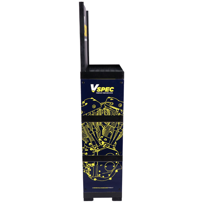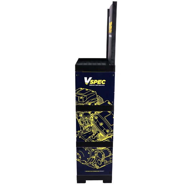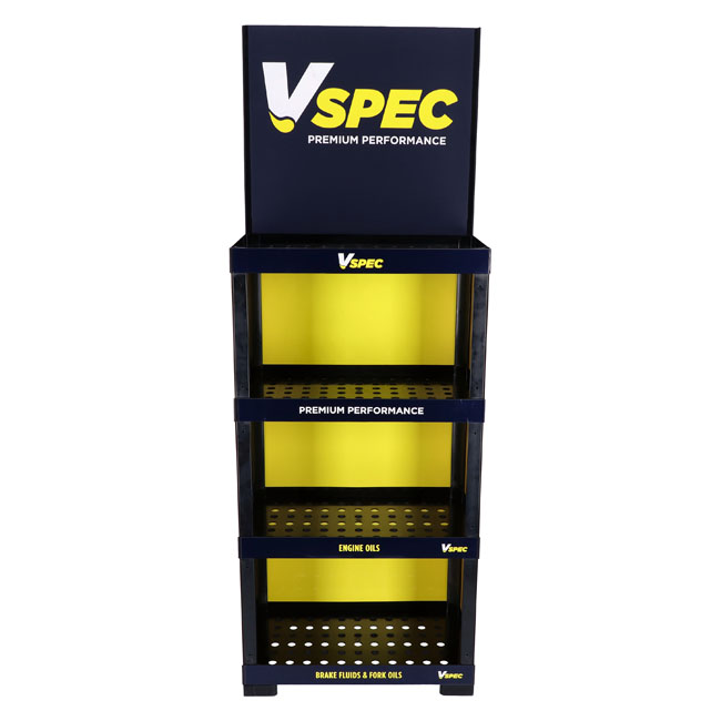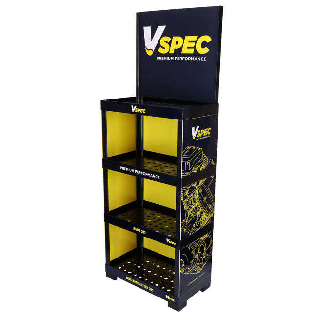 The perfect way to professionally display a great brand. This floor-placed display stand comes with 4 shelves; strong enough to take up to 50kg per shelf. Dimensions of the 3 lower spaces approx. 59.5cm wide x 34.5cm high x 30cm deep. Upper space has unlimited storage height; with a 55cm high billboard that proudly displays the Vspec brand. Made of HIPS (High Impact Polystyrene) with printed parts from cardboard. Overall dimensions approximately 171cm x 60cm wide x 35cm deep.
