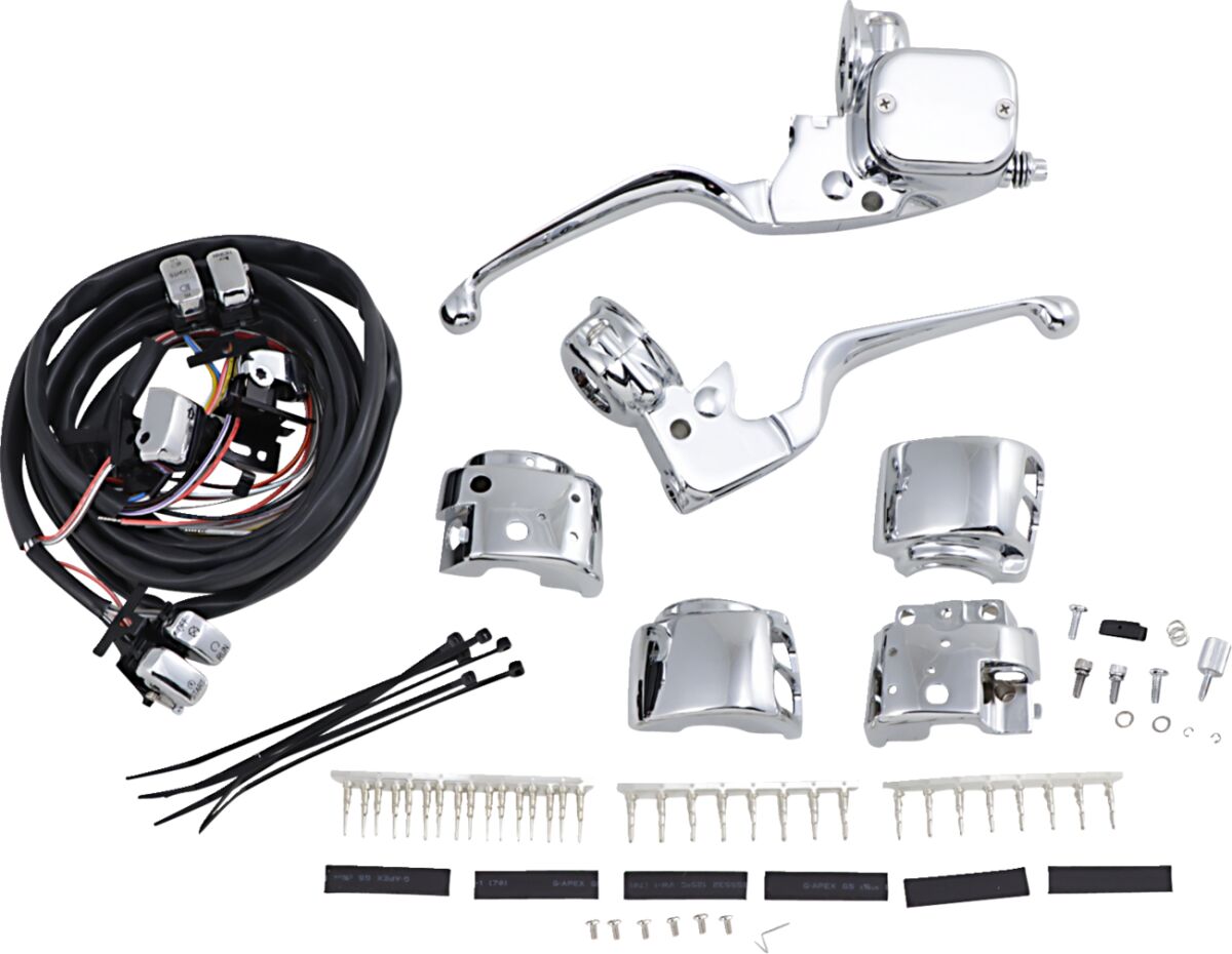 - Kit includea master cylinder assembly, clutch lever assembly, die-cast switch housings with radiused edges and OEM-style clamps.