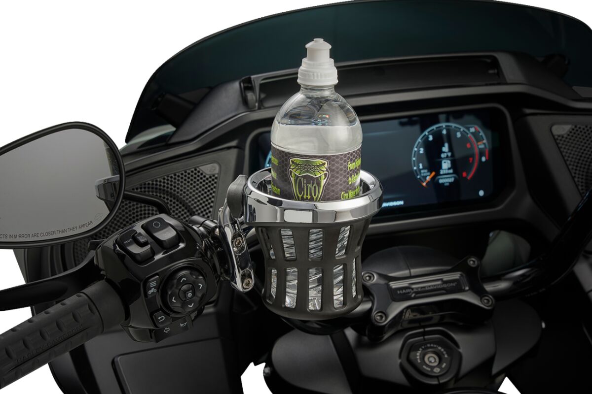 - Ball mount system allows for a broad range of placement and angle adjustmentFor use with Ciro Gen 2 ball mounts.Designed for drinks up to 8 in height and 2 lb total weight.Inside ring width is 3-3/4"; height of basket (including ring) is 4-1/8".For use with left or right control perch mounts with vertical bolt spacing at 1-1/16" to 1-11/16" from center to center (uses included M6 x 1.0 x 45 mm or 1/4-20 x 2" bolts).Fits brake side only on Indian Scout models; Pursuit models require additional hardware (2401-1619/2401-1620).Fits brake side only on Honda GL1800 models with DCT or CB switches installed."