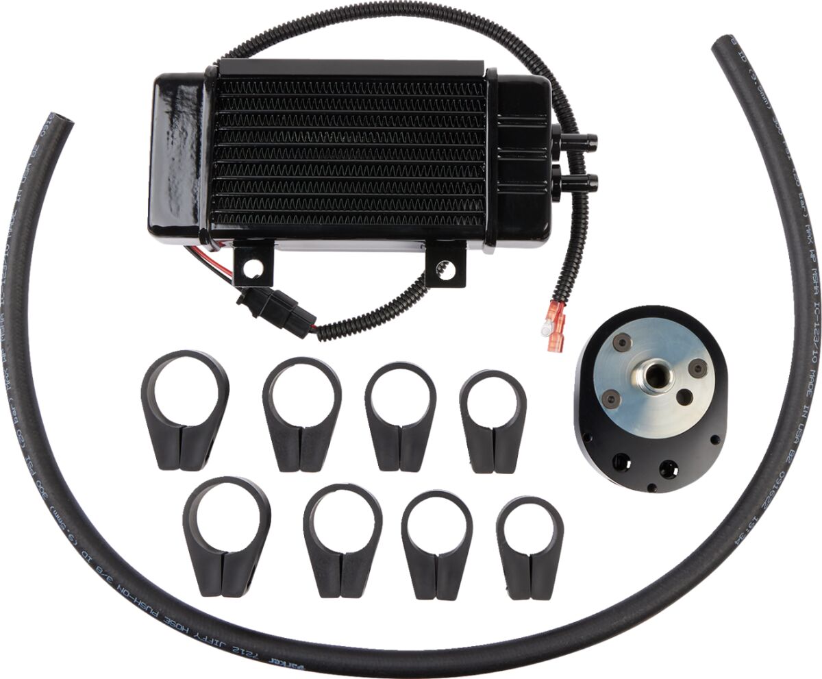 - Includes cooler, sealed-motor fan, oil hose, mounting hardware, automatic thermal fan switch wiring harness and Jagg offset oil filter adaptor.