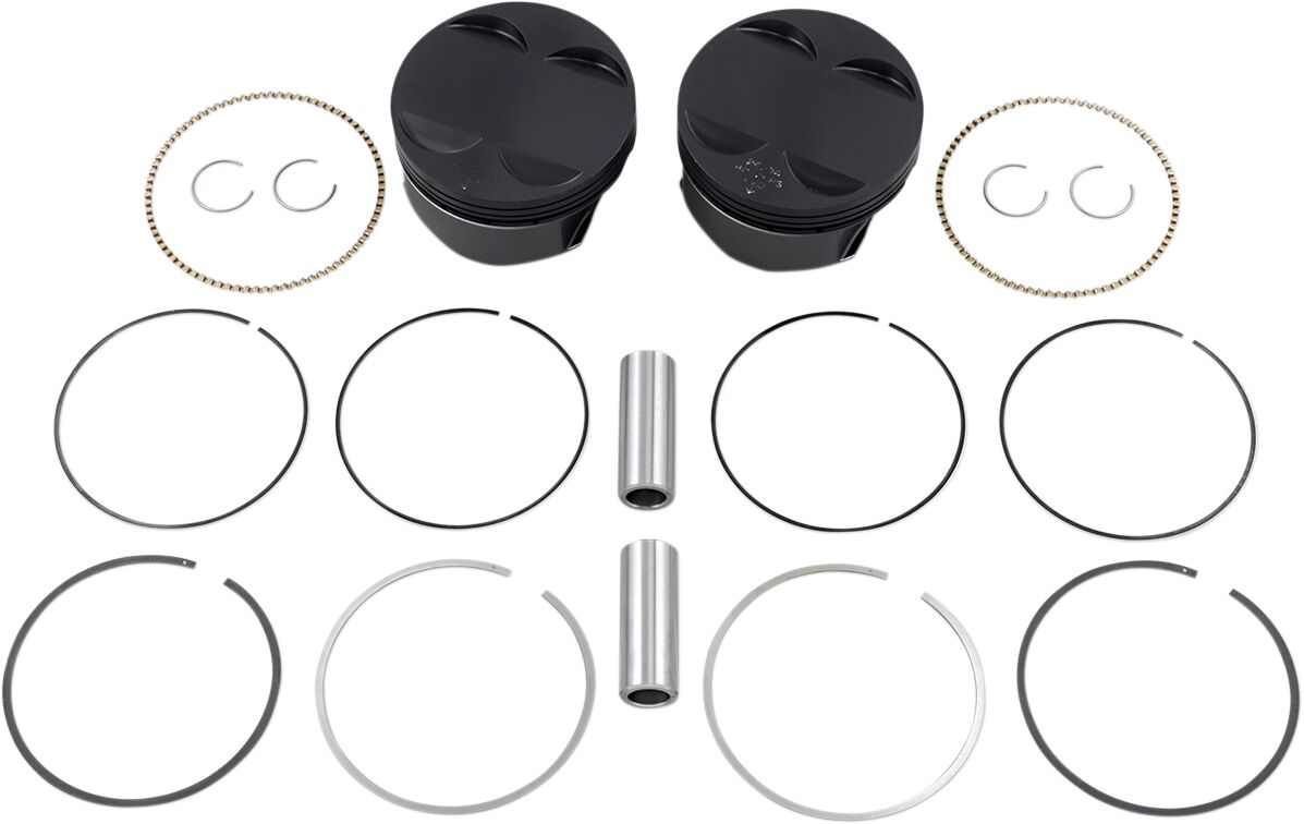 - Made in the USAFlat top with +4 cc volume.Includes:• 2x Black Edition Piston• 2x Ring Sets• 2x Wrist Pins• 4x Cirlips