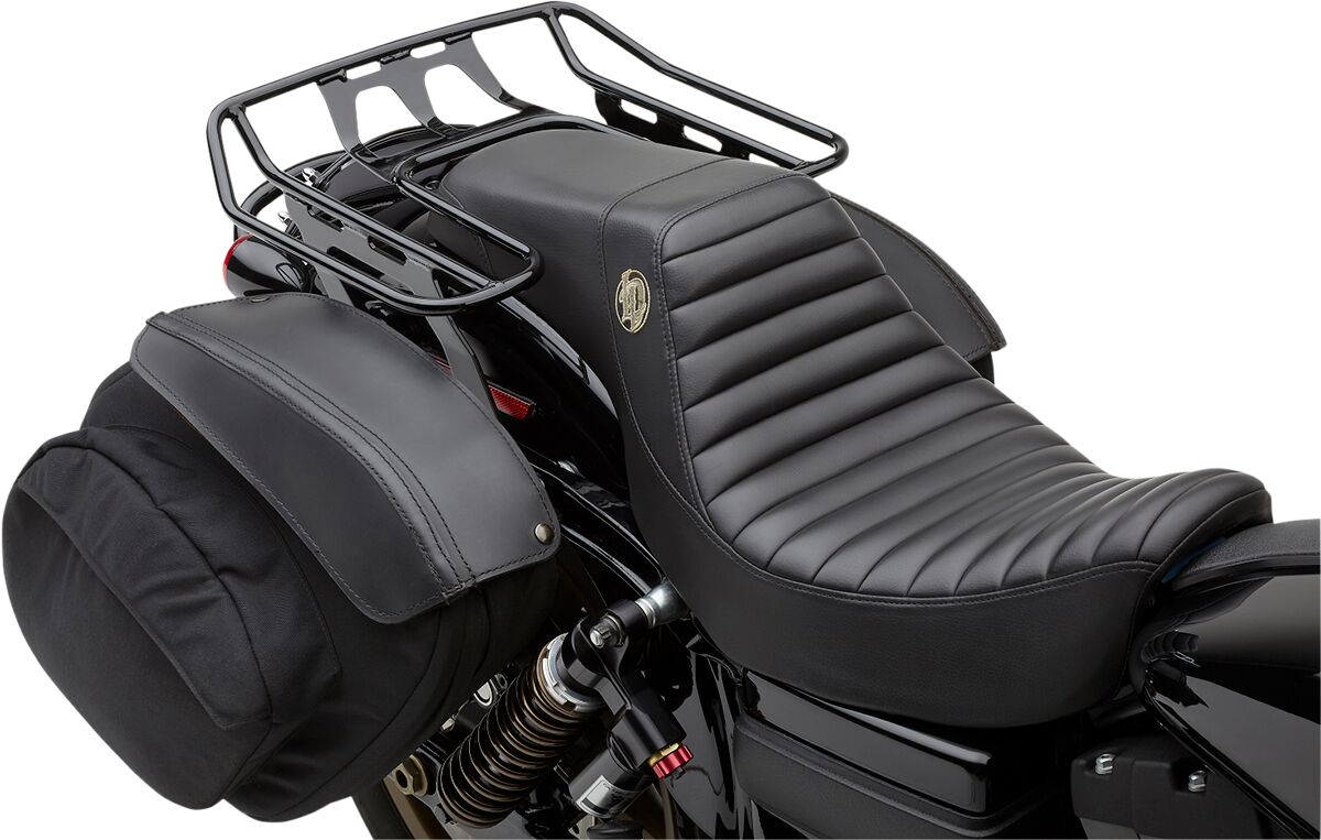 - If aftermarket seat is not Saddlemen or Lucky Daves step ups, then look carefully at the measurements of the opening to ensure the rack will fit around your bike’s seat.Fits Dyna with Saddlemen Seat.