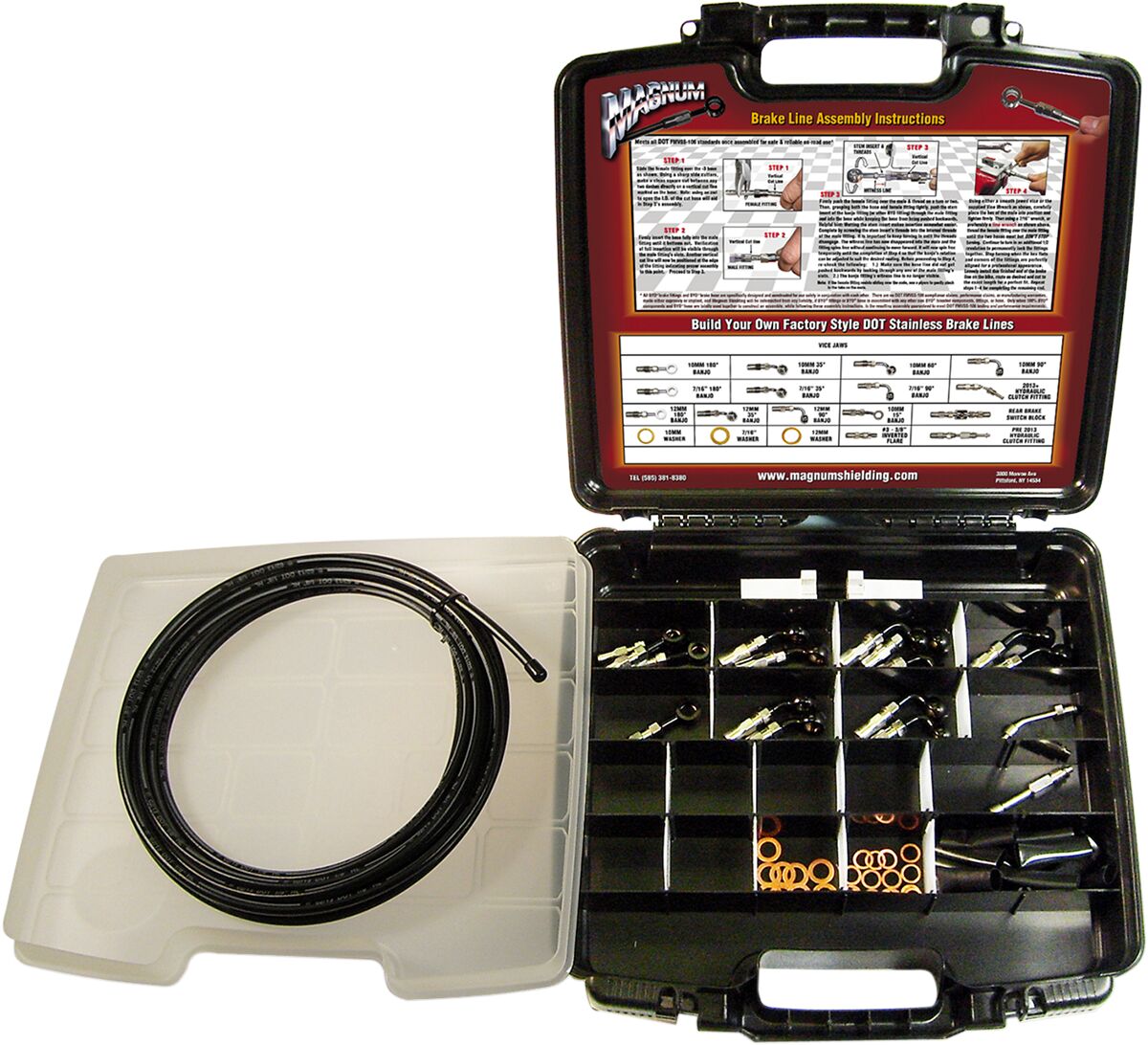 - All kits are organized in a labeled, compartmental carrying case and include 25’ of non-yellowing clear braided stainless steel hose, chrome plated banjos, polished stainless hardware, copper crush washers plus a set of durable Aluminum BYO® Vise Jaws.