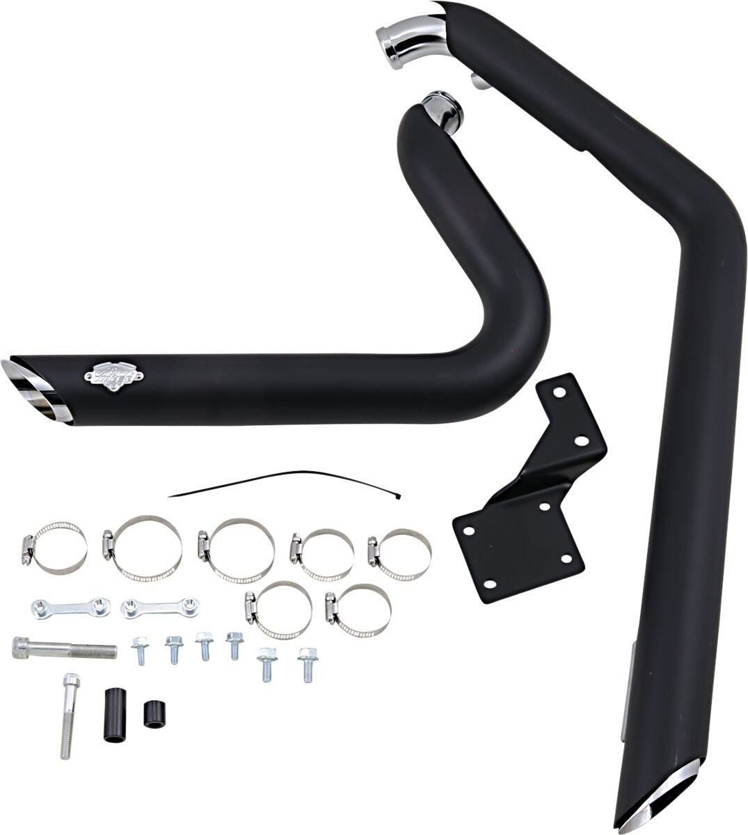 - Black pipes feature full coverage heat shields coated with a race-quality matte black ceramic contrasted with a signature chrome badge and end tips