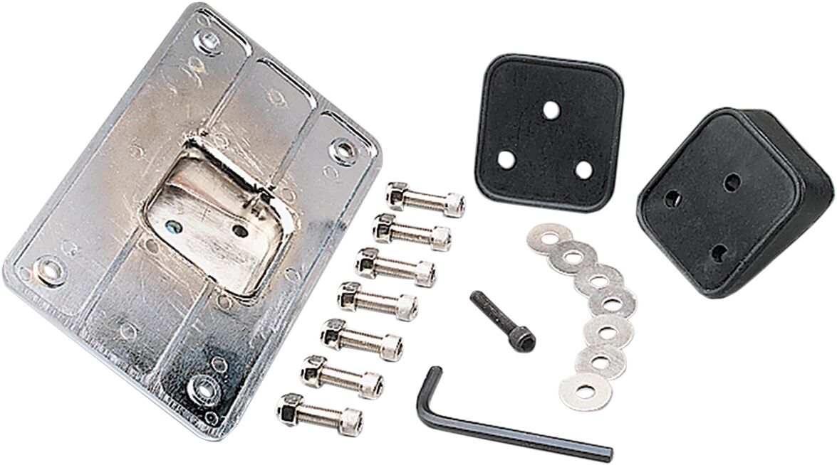 Laydown License Plate Holder- Replaces the standard 3-bolt bracket and tilts the plate back.- Kit includes a rubber wedge so you have an option as to how far the plate lays down.- Accepts most 4 x 7" license plates"