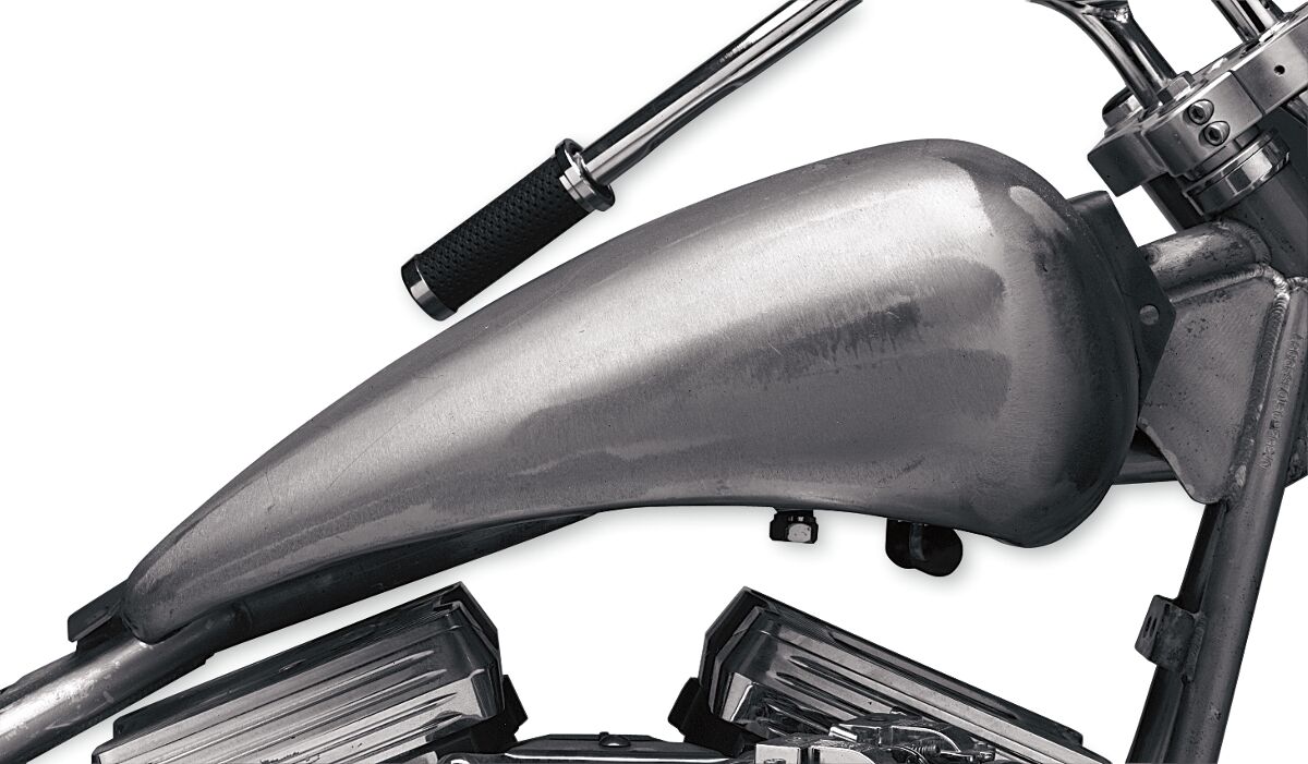 One-Piece 2 Extended Gas Tank- 2" Stretch over stock length; capacity is approximately 4.2 gallons.