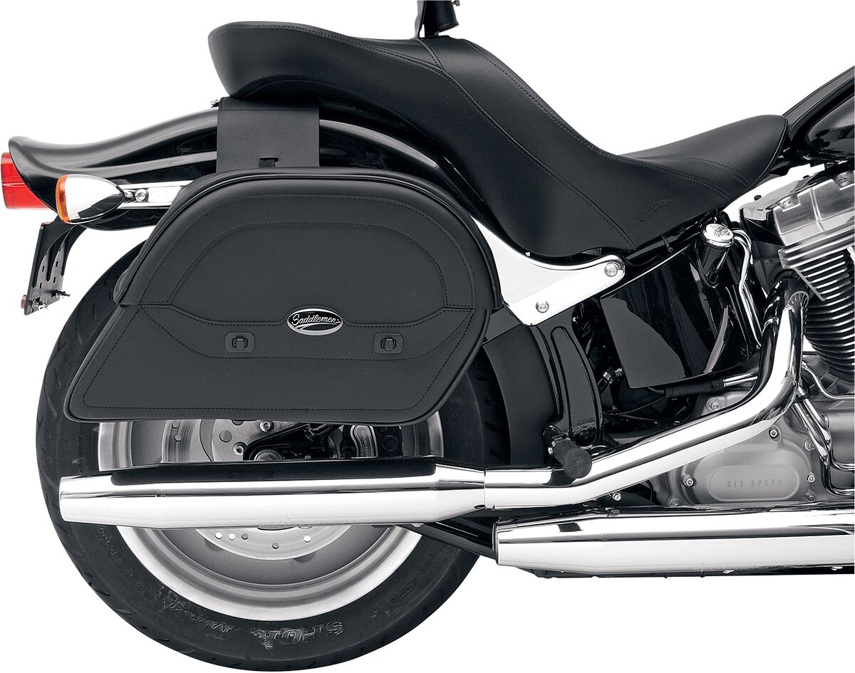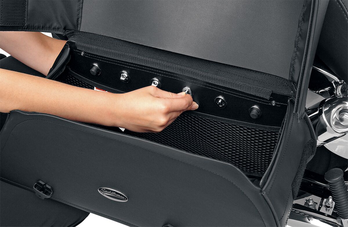 Cruis'n™ Slant Saddlebags- Throw-Over style includes a multi-adjustable yoke which hangs the bags from the fender or seat, and also includes a quick-release bag connection to take off bags without disturbing the yoke or seat and a rear-mounted carry handle.