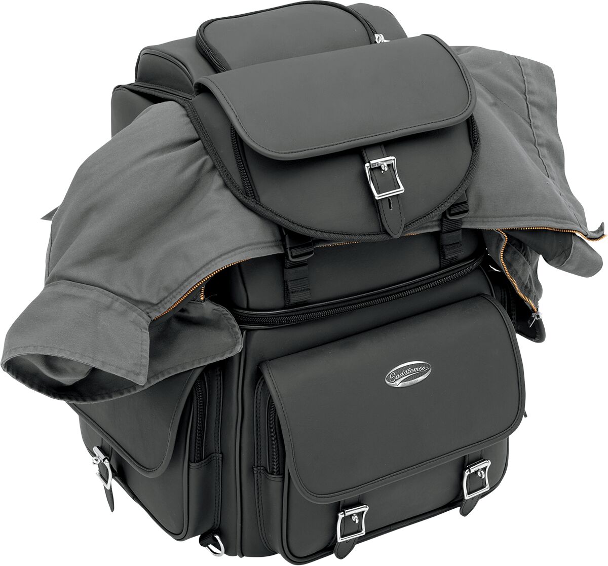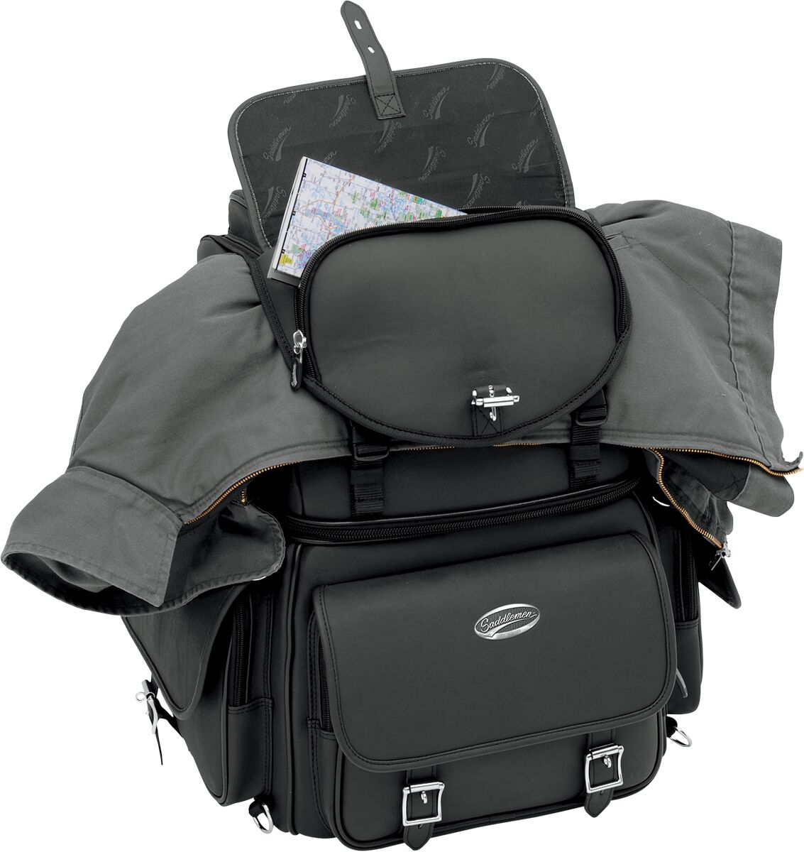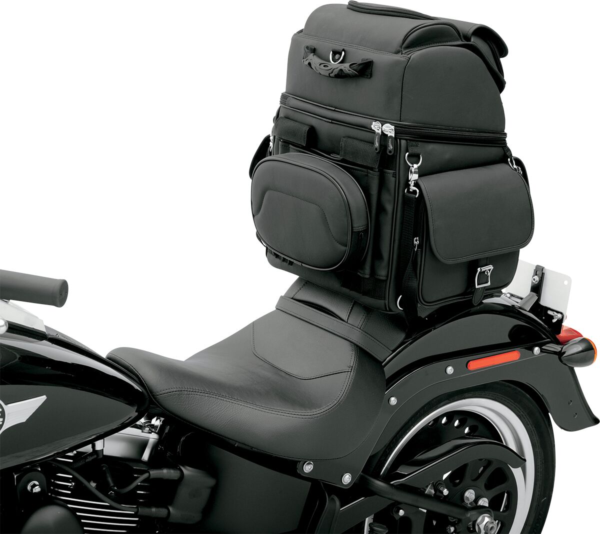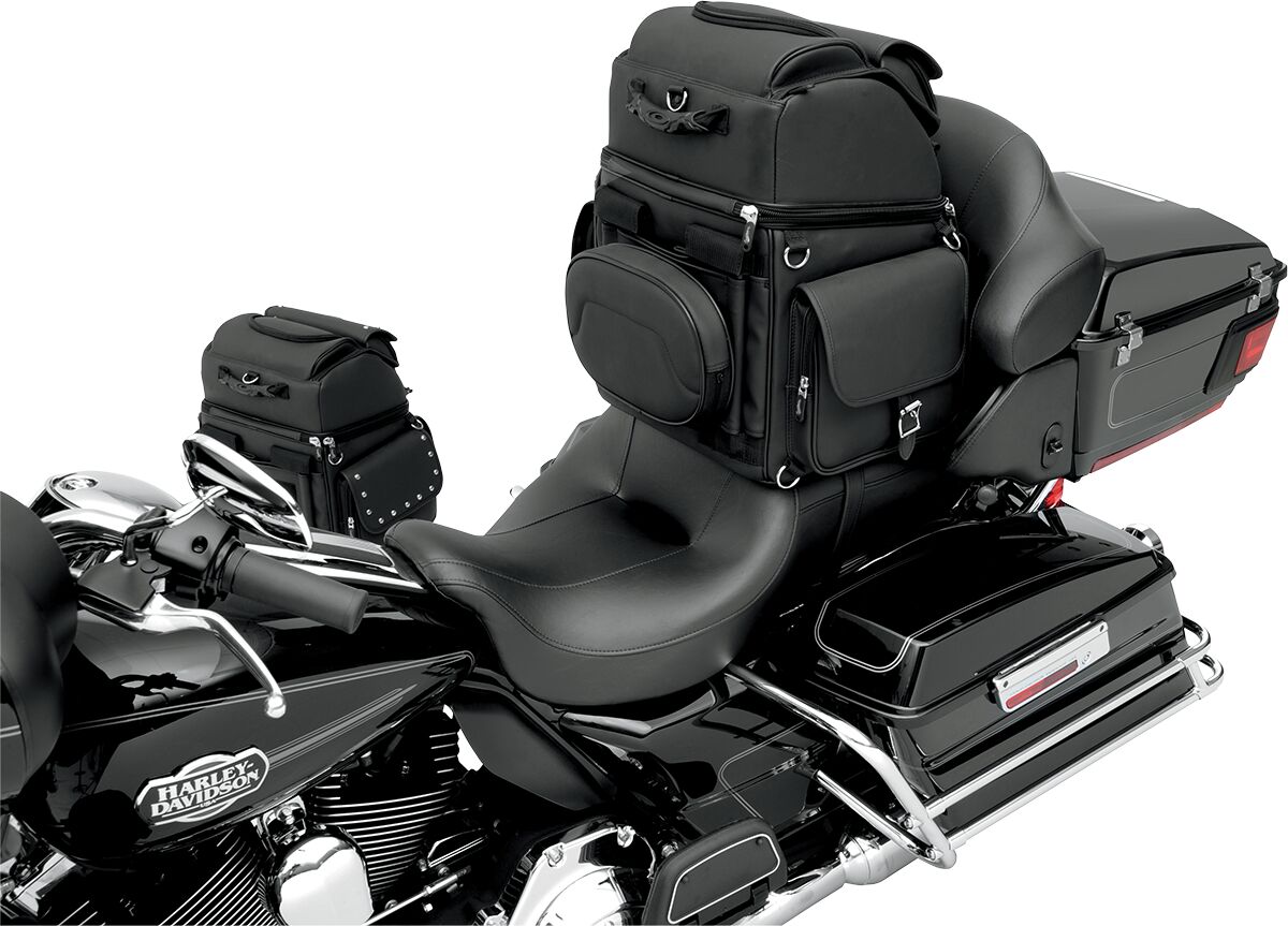 BR3400EX Combination Backrest, Backseat, and Sissy Bar Bag- Rugged blend of leather-grained materials looks great on any type of motorcycle.