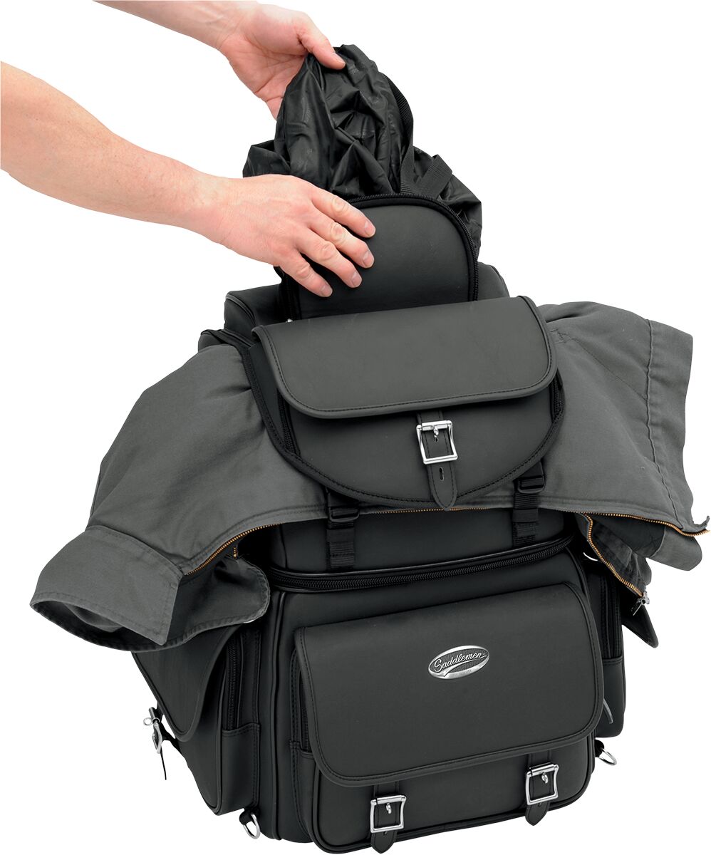 - Two mounting systems included: Saddlemen's Versa Mount™ seat harness or adjustable sissy bar strap system easily attach bag to motorcycle seat, luggage rack, or sissy bar.