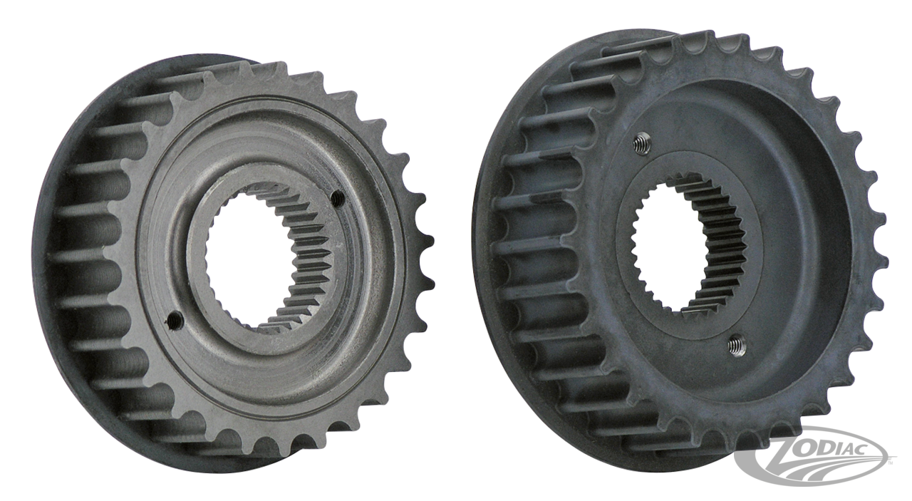 Präzisions-Riemenscheiben aus einer gehärteten Stahllegierung. Erhältlich mit 29, 30, 32 oder 34 Zähnen zur individuellen Anpassung der Sekundärübersetzung. Ab Werk werden alle 5-Gang Big Twin mit einer 32er Riemenscheibe geliefert. Je kleiner diese Riemenscheiben gewählt werden, desto größer ist die Beschleunigung bei verringerter Endgeschwindigkeit. Die großen Riemenscheiben werden für Stroker o.ä. starke Motoren empfohlen. Hinweis: Obwohl bei den Modellen 2000-2006 der schmalere 1 1/8" Riemen (vorher 1 1/2") mit hinterer Riemenscheibe verwendet wird ist die Breite der vorderen Riemenscheiben gleich geblieben.