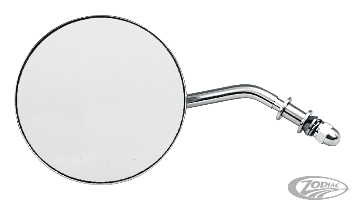 Verchromter, runder Spiegel für alle neueren Modelle. Wahlweise mit langem oder kurzem Schaft. Mit Gewinde am Schaftende und allen nötigen Anbauteilen. Für alle Modelle ab 1965. Werden einzeln angeboten.