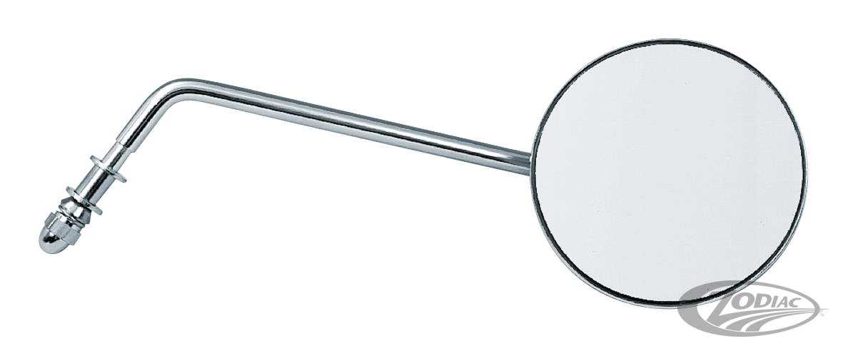 Verchromter, runder Spiegel für alle neueren Modelle. Wahlweise mit langem oder kurzem Schaft. Mit Gewinde am Schaftende und allen nötigen Anbauteilen. Für alle Modelle ab 1965. Werden einzeln angeboten.