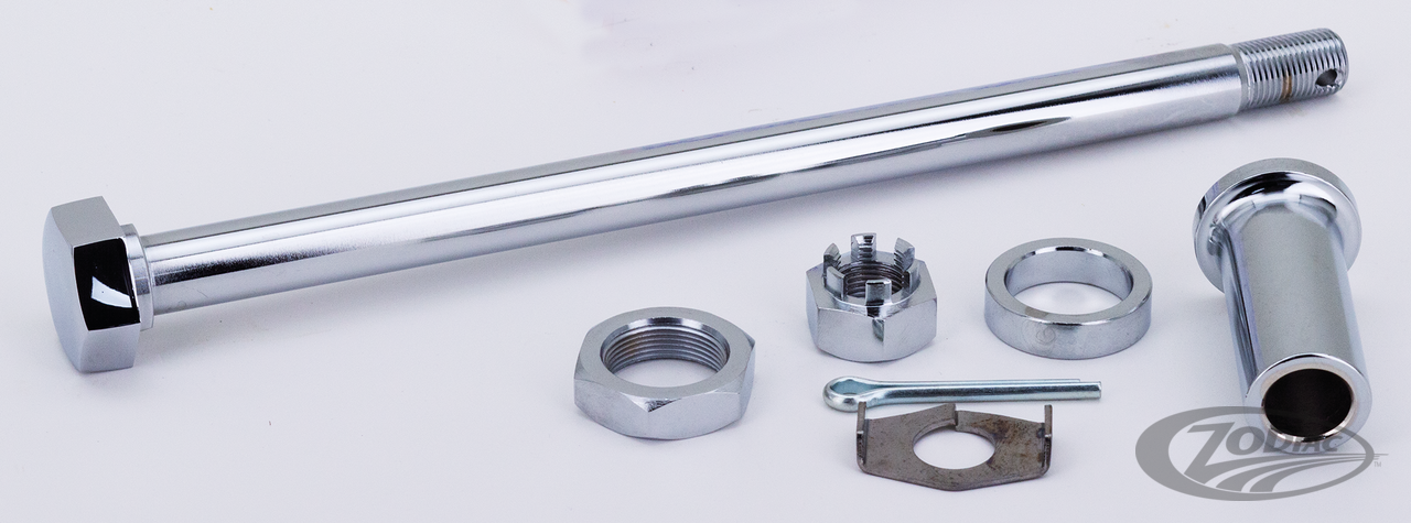 Die größte Auswahl an verchromten Radachsen, wird Ihnen von Zodiac geboten. Achsen für Modelle 1936 bis zu den aktuellen Modellen von heute sind erhältlich. Diese Achsen werden aus vergütetem Chromoly Stahl gefertigt, dreifach verchromt und zum Schluss (nach dem Verchromen) auf eine Toleranz von +/- .0005" geschliffen. Die Achsmutter wird auf der Achswelle durchdringungsverschweisst und vor dem Verchromen sorgfältig entgratet und scharfe Kanten glatt geschliffen. Bitte beachten Sie, dass bei neueren Modellen oft die gleiche OEM Nummer für die Radachse verwendet wird, unsere Kits jedoch die entsprechenden Achsspacer für die aufgelisteten Modelle beinhalten. Hinweis: Achsen ZPN 339147, 339193 & 339190 eignen sich ebenfalls für 2012-2016 FLD, 2008-2017 FXDF & 2007-2017 FXDWG wenn die mitgelieferten Spacer weg gelassen werden.
