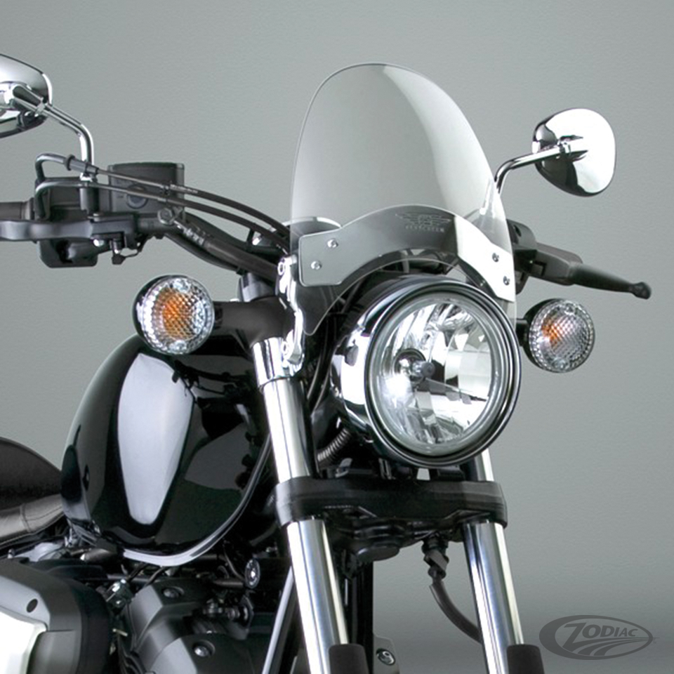 Für Sportster, Dyna, Softail, Touring, FX, FXR, Indian und Victory Modelle mit konventioneller Teleskopgabel und einem Durchmesser von bis zu 43mm zwischen den Gabelbrücken, Leicht getönte Scheibe mit verchromter vorderer Zierplatte und Montageteilen (TÜV)