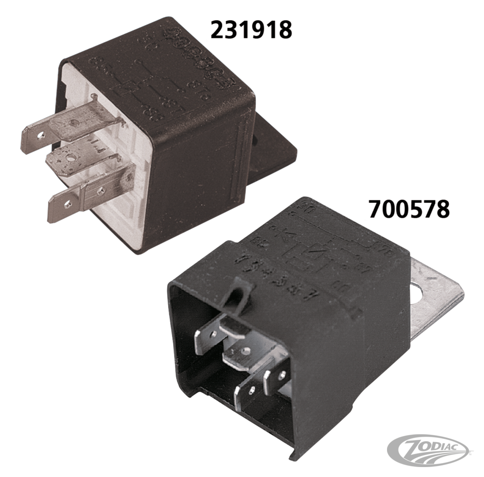 Das Early Style Relais (OEM 31506-79B) findet an den meisten Harley-Davidson Modellen von 1980-1992 Verwendung. Das Late Style Relais (OEM 31504-91A) besitzt eine integrierte Diode und wurde ab 1991 in den Touring und FXRP Police Modellen verbaut, sowie bei 1992-2008 Big Twin und 1992-2004 Sportsters. Erhältlich als original Ersatz oder als Version mit Schürze, welche die Anschlüsse gegen Witterungseinflüsse schützt. Das Late Style Relais kann auch als Ersatz für die Early Style Ausführung verbaut werden.