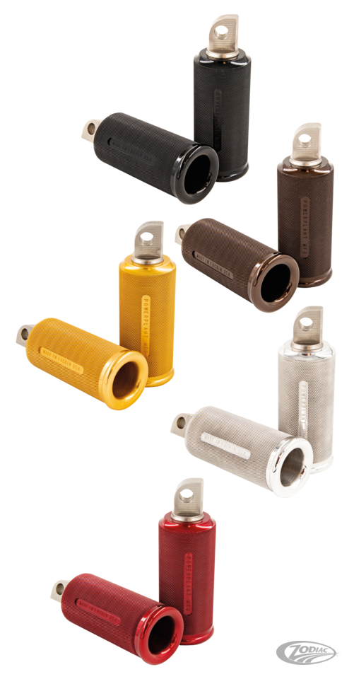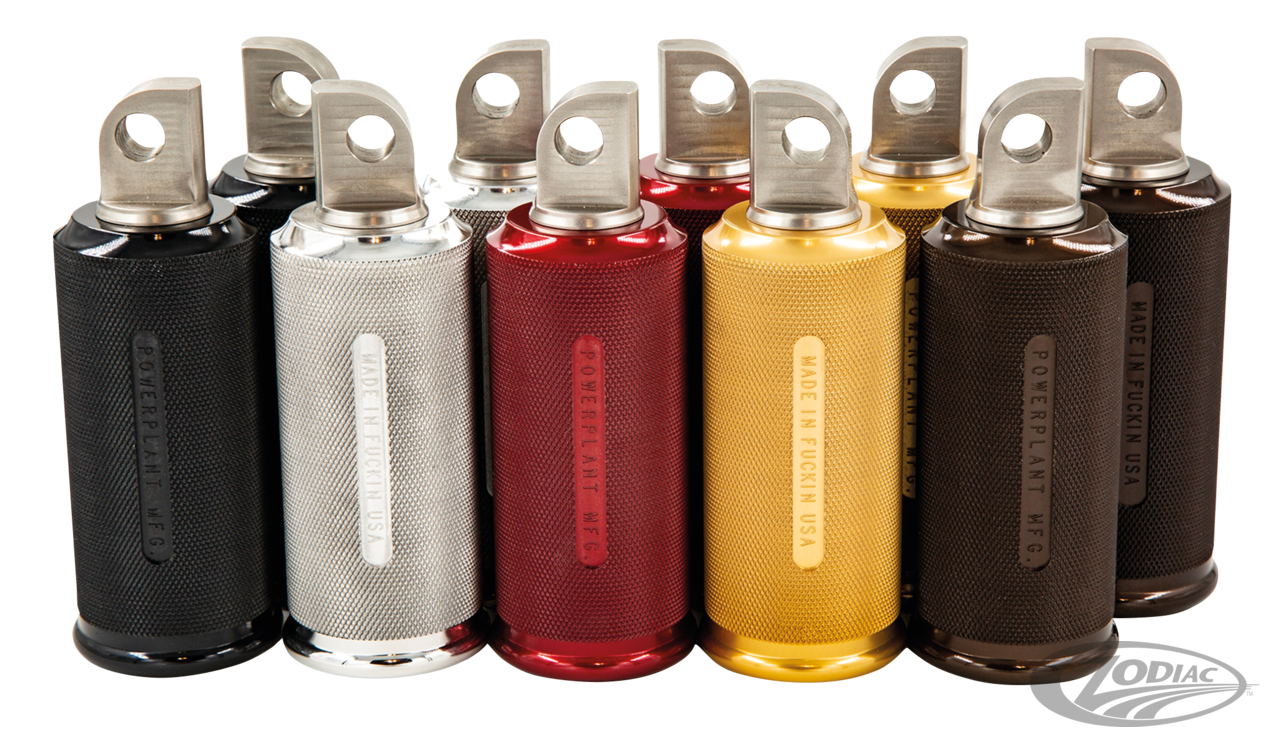 Gerändelte und harteloxierte Aluminium-Fußrasten mit einem Gabelkopf aus Edelstahl, montiert für optimale Festigkeit, Stabilität und Langlebigkeit. Graviert mit "MADE IN FUCKIN USA" und "POWERPLANT MFG". Die Fußrasten haben einen Durchmesser von 1 3/4" (44,5 mm) und eine Länge von 3 3/4" (95 mm). Sie passen in die Fahrer- und Beifahrerposition der meisten Harley-Male-Mount-Anwendungen und werden paarweise angeboten.