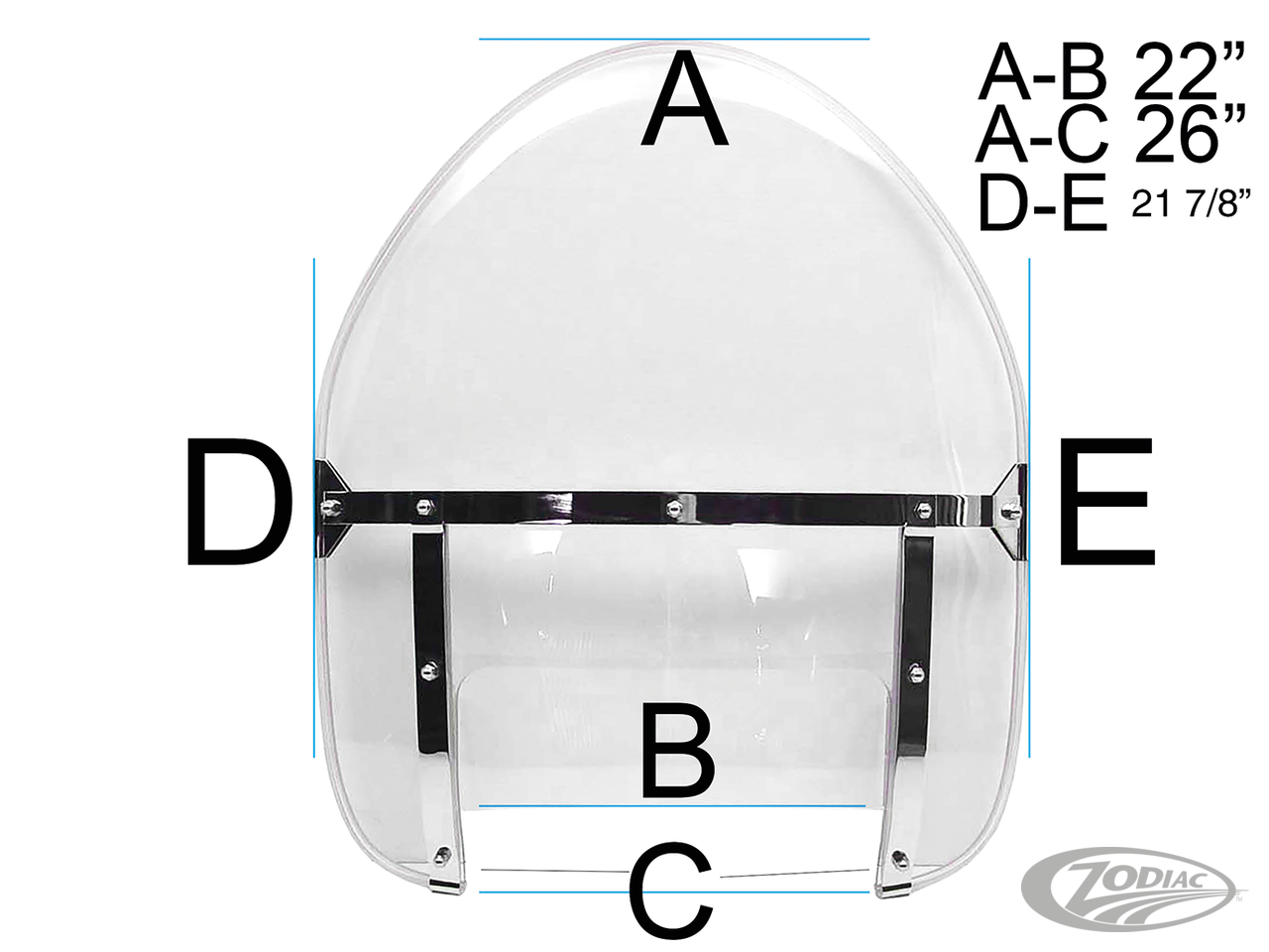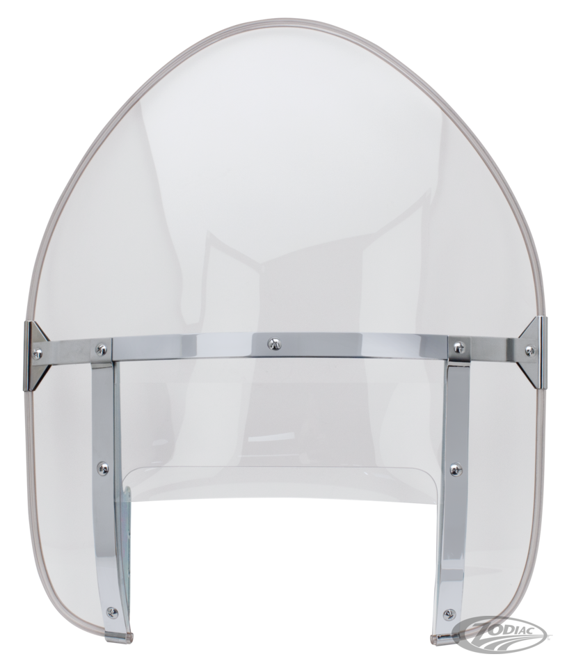 Nachbildung der Windschutzscheibe mit spitzer Wulstrandkante oben, wie sie bei Windschutzscheiben im Police-Style zu finden ist. Wird komplett mit Halterungen und Hardware geliefert. Die Scheibe ist 21 7/8 Zoll (55,6cm) breit und 22 Zoll (56cm) hoch, gemessen von der Oberkante des Scheinwerferausschnitts.