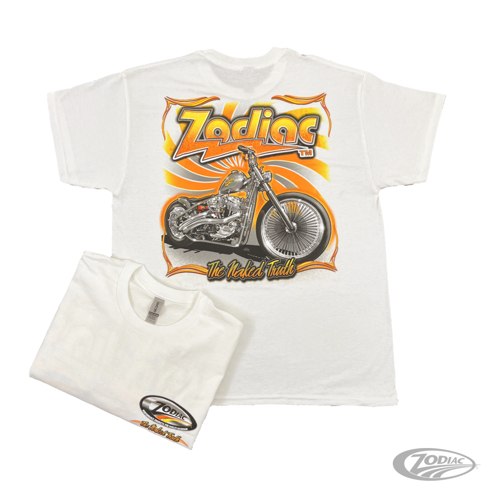 Holen Sie sich die nackte Wahrheit auf den Rücken mit diesem T-shirt. 70-er Jahre Design mit dem Retro Zodiac Logo und der Naked Truth Starrahmen Sportster auf der Rückseite sowie dem Zodiac Logo des 21. Jahrhunderts auf der Vorderseite.