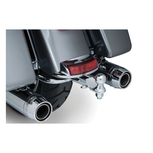 Chrome ball with black powder coated hardware. Engages the hitch frame vertically on both sides for optimum structural support. Can be installed in either of two positions depending on fender configuration. Fits with or without saddlebags or light rails. Includes hardware. Note 1: Receptible and wiring harness are necessary to complete the installation. Note 2: Comes with USA sized 1-7/8" (47.6mm) diameter ball.