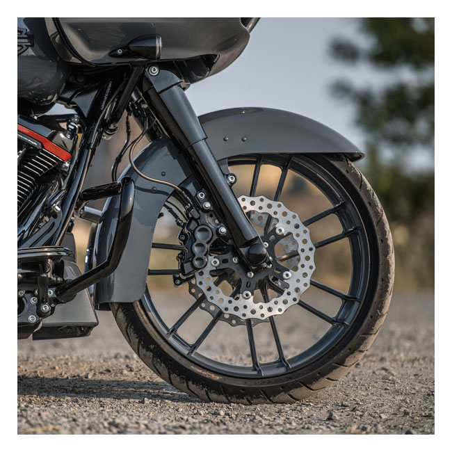 Universal floating brake rotor in 'mount style B'; with counter bored 3/8" mount holes with a 3.25" BCD (Bolt Circle Diameter) and 56.3mm ID hub mount. Bolt-on installation for many front & rear stock or custom applications. Can be universally used on models with the stock 5-bolt H-D mount pattern with an inner hub diameter of 56.3mm. - High performance floating brake rotors designed to enhance braking performance and style of factory or aftermarket wheels- 420 Stainless steel construction; laser cut & drilled for optimum performance- Heavy duty stainless steel design made for the weight of heavy Tourings- Universal fitment- Can be installed on the front or rear of most H-D models with 5-bolt hub mounted factory rotors - 3/8" (9.5mm) counterbored mount holes- 56.3mm I.D.