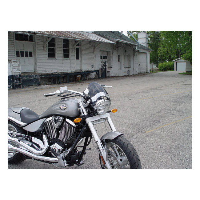 National Cycle Flyscreen® LS dark tint, chromeABE approved; fits 52-56mm OD forks Height: 8.5" (21.6cm) / Width: 9.25" (23.5cm) Mounting hardware included; curved bracket FMR Hardcoated Lexan® Polycarbonate