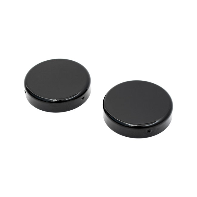Killer Custom, fork tube cap bolt covers. Gloss blackFork tube caps to cover upper chrome bolts. Gloss black powder coated precision CNC machined billet aluminum construction. Installs with a set-screw.