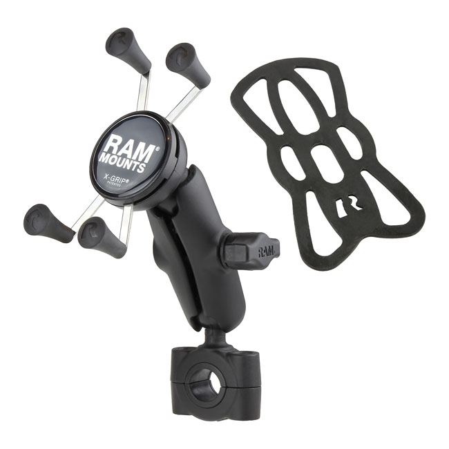 - Small Phone X-Grip - For phones 1.875" (47.6mm) to 3.25" (82.6mm) wide and max .875" (22.2mm) deep - For 3/4" (22mm) to 1" (25.4mm) round bars - Medium 3" (76mm) ball to ball socket arm - Comes with the X-Grip; a socket arm and a 'Torque' base handlebar clamp mount - Holds max. 2 lbs / 907 gram normal use or 1 lbs (454 gram) heavy duty use. Take your mobile entertainment on the road with the RAM® Torque™ handlebar and rail mounting base. Sizing inserts are included to provide a snug fit and offer additional protection for the rail. The mount utilizes nylon-insert locknuts to prevent loosening in high vibration environments. This low-profile mount is the perfect way to secure your personal electronics and small accessories in any high-vibration environment. The included X-Grip® cradle has a clean and clever four leg design that sports great holding power without hiding your phone behind foam pads and plastic. The spring loaded X-Grip® cradle expands and contracts; allowing for a perfect custom fit of your cell phone. The perfect complement to the modern sleek interior of today's vehicles; the RAM X-Grip® is the cell phone cradle evolved. The X-Grip® includes a device tether recommended for outdoor applications. It is important to verify the dimensions of your handheld device with a case/sleeve/skin when determining the overall size. RAM Mounts - The way It Works? A 3-piece system: 1 the mount base; 2 the connecting arm; 3 the device holder. - 1 the mount bas