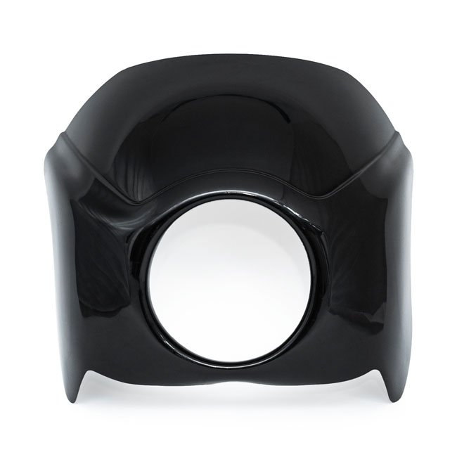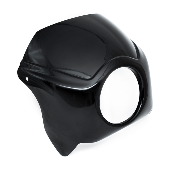 A hardcore fairing that offers bolt-on installation ease. Complete with a powder coated gloss black steel mounting bracket; headlamp bracket and required required hardware. Made of hand-laid unpainted gel coated fiberglass that is very stiff; strong; straight and light.Note: Fitment checks are required before painting and final assembly.