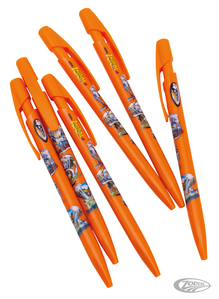 Gut schreibender Kugelschreiber in orange mit Aufdruck des berühmtesten Motors der jemals aus Milwaukee kam.