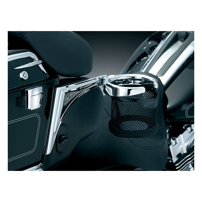 Kuryakyn, Passenger drink holderChrome; with mesh basket; right side. Note: Will also fit with accessory rear speaker kit; except for specified models.