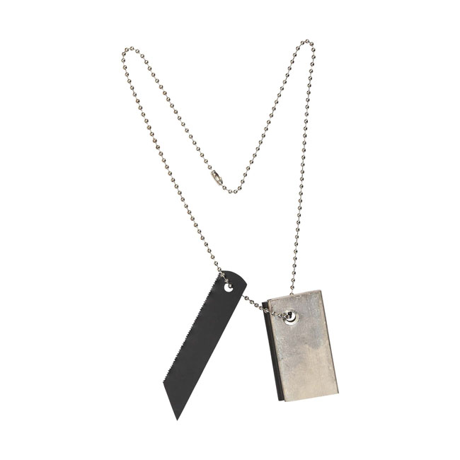 Tradional flint adhered to a magnesium block. Scrape shavings off the magnesium block with the hacksaw blade. Then ignite it by strikings sparks on the magnesium with the knife along the flint. The shavings of the magnesium block burn easily and become very hot; which is the ideal way to start a fire.
