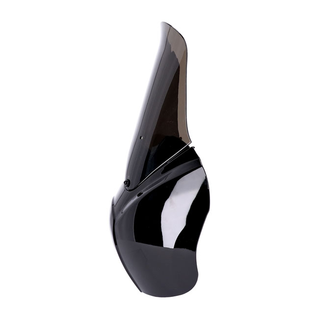 Tinted 15" windshield. Gloss black painted ABS construction. Installs to the bottom triple tree with the riser bolts and the bottom mount headlamp. Includes brackets and hardware for installation.