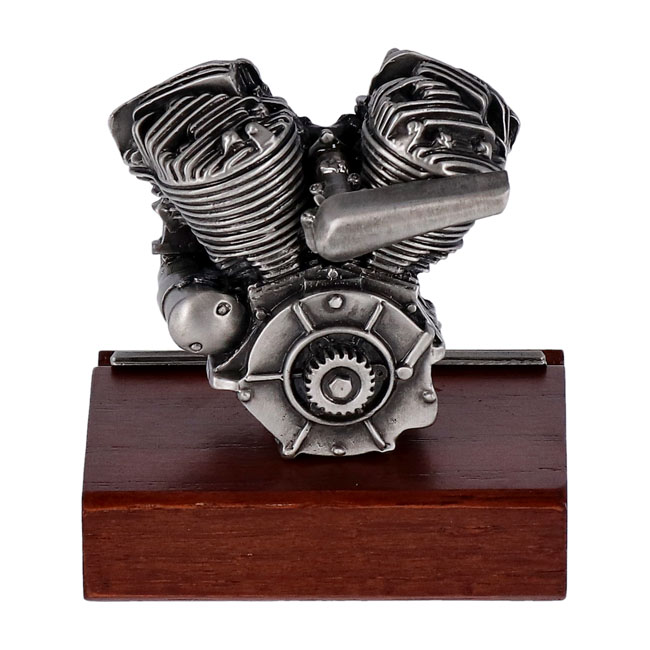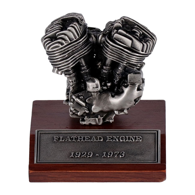 V-Twin Mfg, Flathead motor modelFeaturing pewter construction on a wooden display base. Base and motor height: 3-3/8"