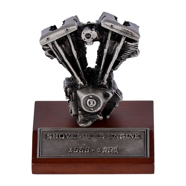 Featuring pewter construction on a wooden display base. Model measures 2-3/4" x 2-3/4" at the base. The overall height including the motor measures 3-1/2". The overall height of the Shovelhead motor is 2-5/8". Width of the motor is 2-1/4".