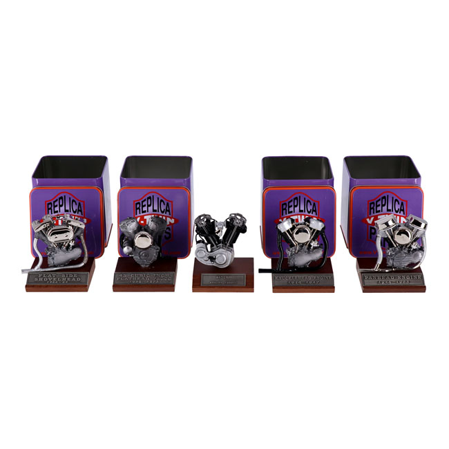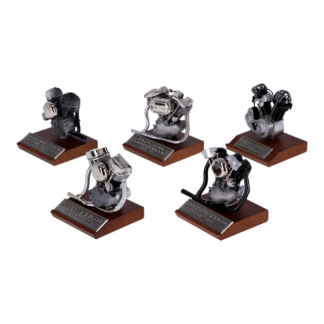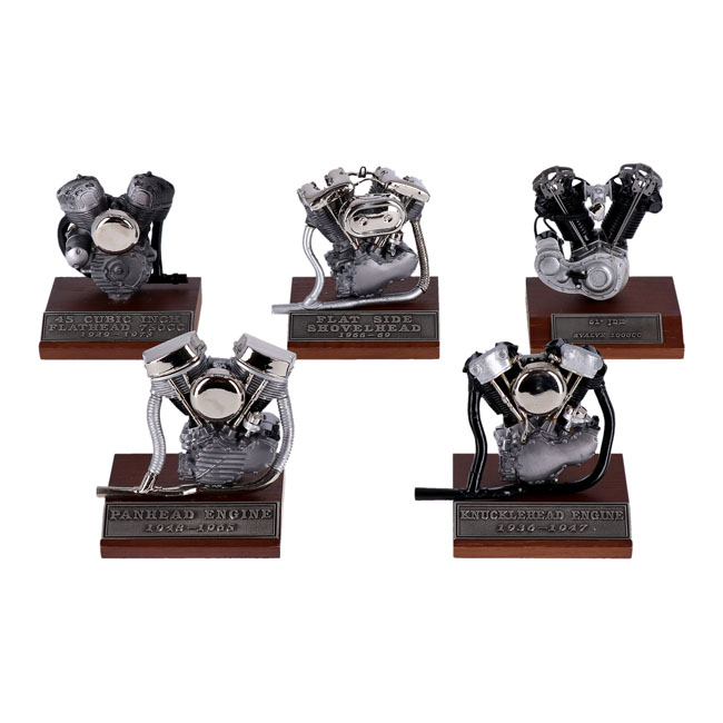 Includes: 61" JDH 1000cc 1915-1924 Racer; Knucklehead; Panhead; Shovelhead and 45" WL engines each on it's own wooden base; with a name plaque attached.Measurements: JDH model height= 3-9/16'' JDH hwith base height= 4-3/8'' Knucklehead model height= 3-1/4'' Knucklehead with base height= 4-1/4'' Panhead model height = 3-9/16'' Panhead with base height= 4-3/8'' Shovelhead model height= 3-5/8'' Shovelhead with base height= 4-7/16'' WL model height= 3-5/16'' WL with base height= 4-1/8".