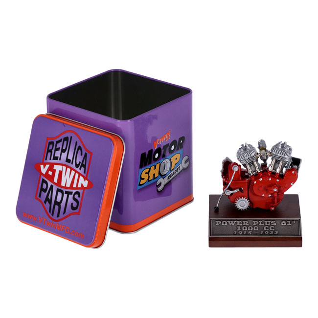 V-Twin Mfg, 61" power plus 1000cc 1915-1920 motor modelFeaturing cast pewter construction on a wooden display base.Measurements: Length= 5'' Height= 6'' Width= 5''