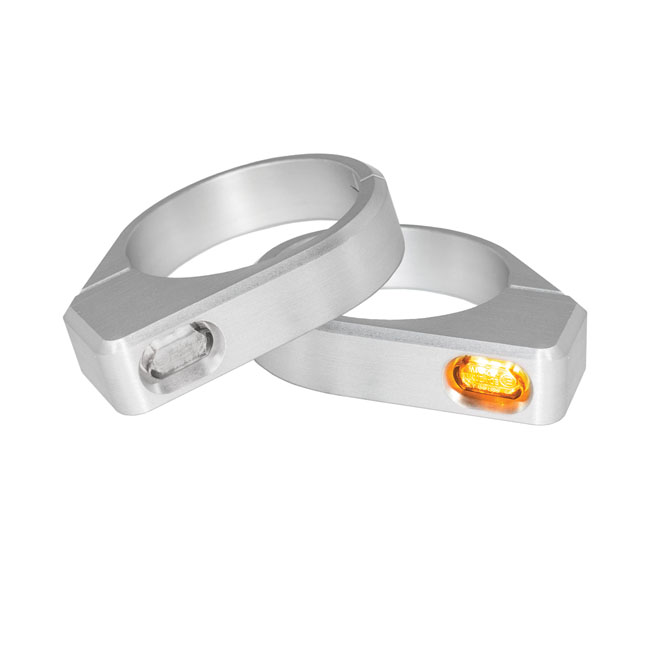 Silver anodized. Mounts to 54-56mm diameter forks. The perfect way to install Super Small EC approved front turn signals that go virtually unnoticed; until activated! Homogeneously bright LED units offer excellent visibility in traffic. The HeinzBikes 'Stairs' is a 2-piece locking system; allowing installation without disassembling the fork. Housing are CNC machined aluminum with an anodized finish for lasting good looks. - CNC machined aluminum housings - Anodized finish - Homogeneously bright LED - Excellent visibility in traffic - 2-piece construction - No fork disassembling required - 10-minute install